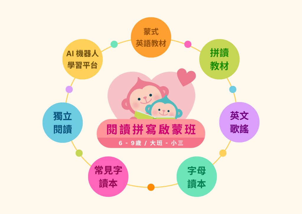 - 閱讀拼寫啟蒙班分成三部分,利用自製教具、AI機器人學習平台、協助孩子在家可以反覆複習。卡、繪本、課堂活動等建立孩子的語言經驗,利用作業本確認與展現孩子的學習成就。