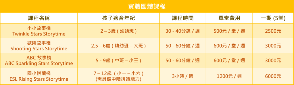 課程介紹: 這個時期是孩子一生中學語文效果最好的時候,小小故事棧(Twinkle Stars Storytime)用音樂刺激大腦,用繪本故事培養英語耳朵,透過親子同樂,早期共讀,建立對英文的好感度。
